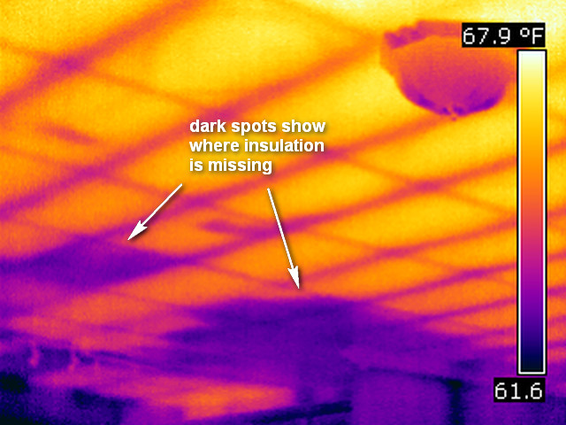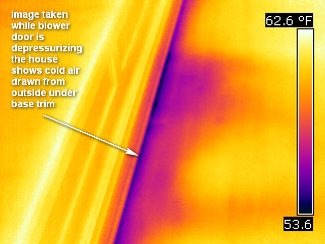 We use an infrared camera to identify the areas where air leakage is occurring and insulation may be deficient. Infrared cameras see heat instead of light. Warmer areas are lighter colors and colder areas are darker colors. Here are some examples: